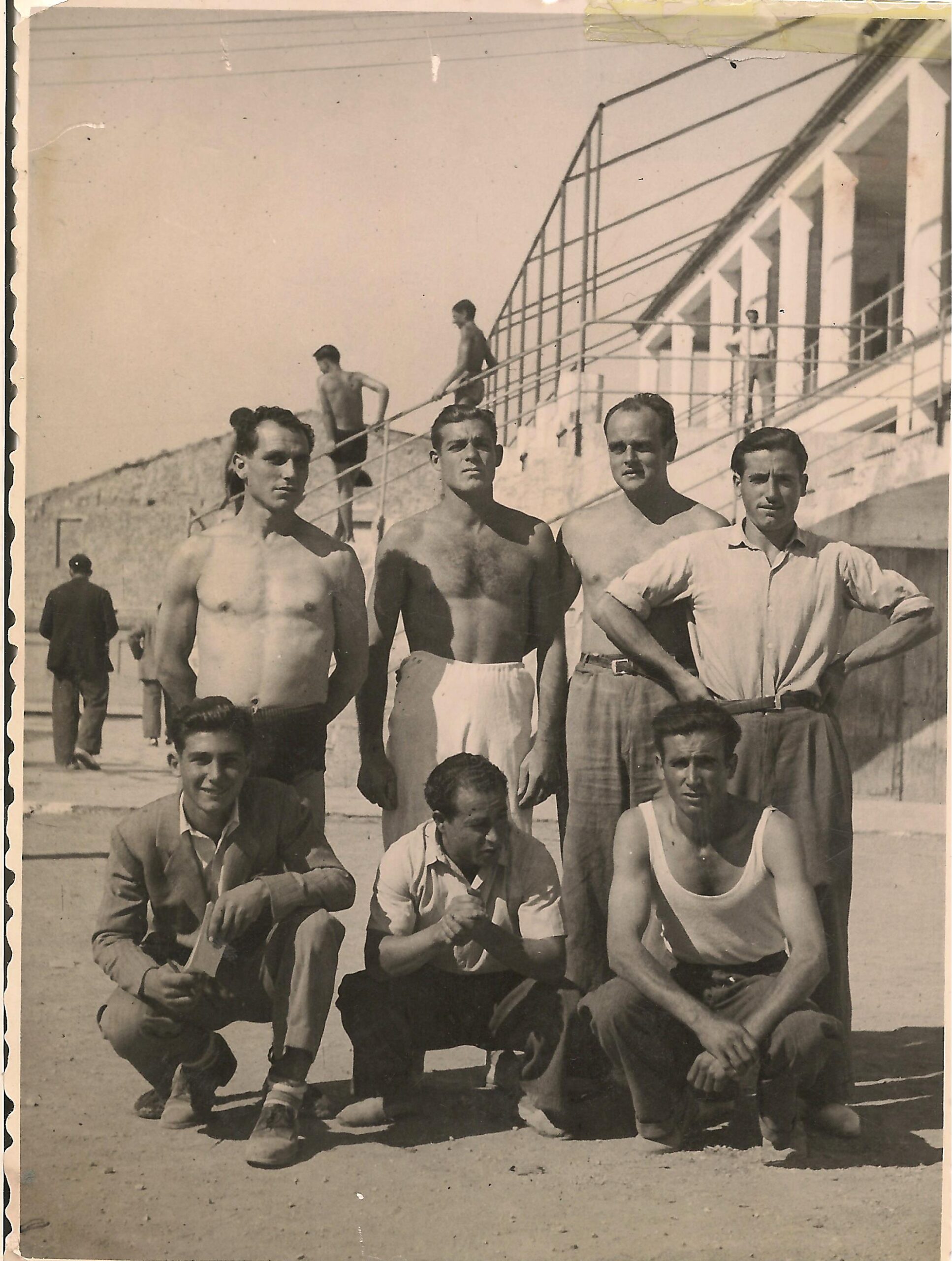 Drets: Jaume Basas Riba, Jaume Varea, Xavier Pallarés, Enrique de la Torre (entrenador), Joaquim Basas Riba i Ramón Llanas. Ajupits: Ángel Chávez, Joan Basas Riba, Joan Basas Bacardit, Andreu Navazo, Joan Baptista Papaseit i Miquel Piqué.