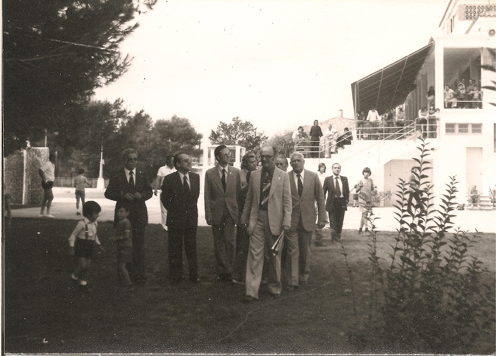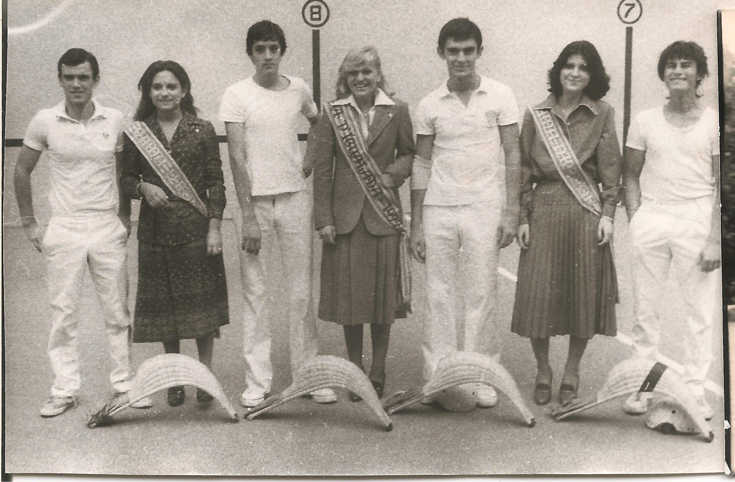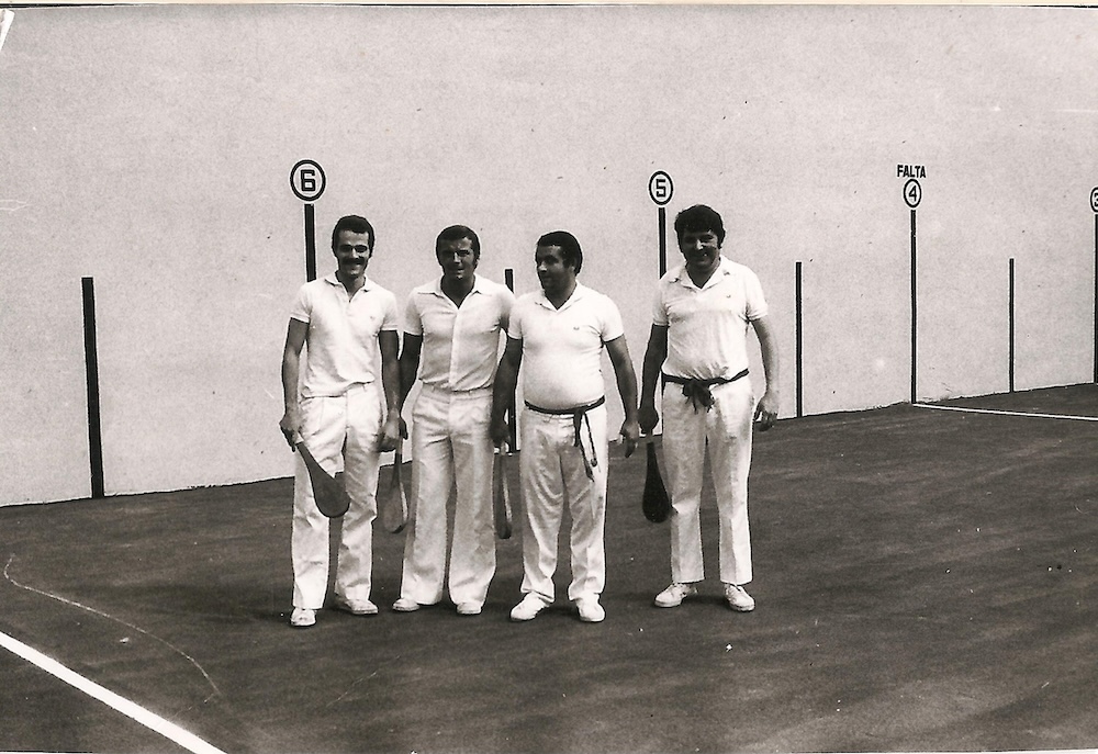 Autoritats a la inauguració del nou frontó reglamentari el 21 de setembre de 1975, actualment en servei. Veiem l’alcalde d’Igualada i diputat provincial, el Sr. Ramón Grau; Manel Canals; Ferran Puigvert, president de la Federació Espanyola de Pilota Basca; Sr.Mendiguren, vicepresident de la Federació Catalana; Lluís Basas, Manel Basas i “pelotaris” del Club Natació Barcelona.
